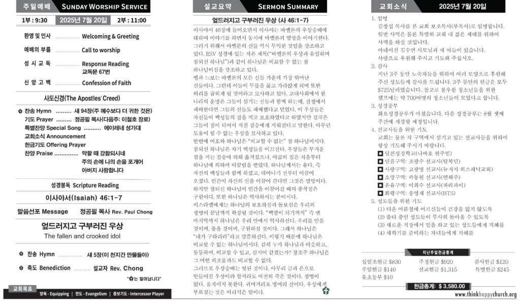 지난 3주 동안 노숙자들을 위하여 여러 모양으로 후원해 주신 성도들께 감사를 드립니다. 3주 동안의 헌금은 모두 $725달러였습니다. 참고로 불우한 청소년들을 위한 캠프에는 약 700여명의 청소년들이 모였다고 합니다.